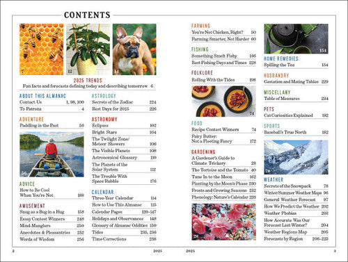The Old Farmer’s Almanac has been making every day special since 1792, and, with the 2025 edition, it continues this tradition in its inimitable fashion. Trusted by generations from all walks of life for its honesty and accuracy, the Almanac delivers fun facts, predictions, feature articles, and advice across many interest areas to readers who actually live—or aspire to live—the country lifestyle, with the intent of helping them to make better decisions. As a calendar of the heavens, it provides detailed daily astronomical data (Sun/Moon rise/set times, length of day), tide times, and planet/star sightings for every sky watcher, from novice to expert. As a calendar of the year, it presents annual and seasonal events, holidays, anniversaries, and timely trivia; astrological “Best Days” and cycles; and much more for the curious and the conscientious. As a time capsule of the year, it contains cultural trends; weather forecasts and conditions; articles on interesting topics such as gardening, home arts and remedies, amusements and contests, history, husbandry, nature, cooking and recipes, folklore, pets, and sports; and more—all in a way that is “useful, with a pleasant degree of humor.”